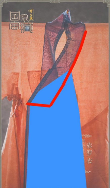 孔府这件白罗中单,因为面料为“白罗”,所以可以透出清晰的内部结构,如下图,红线处为领线缝合线条,蓝色区域为接衽部分,可以清晰看出白罗中单的接衽片顶部显著高于领线缝合线条。