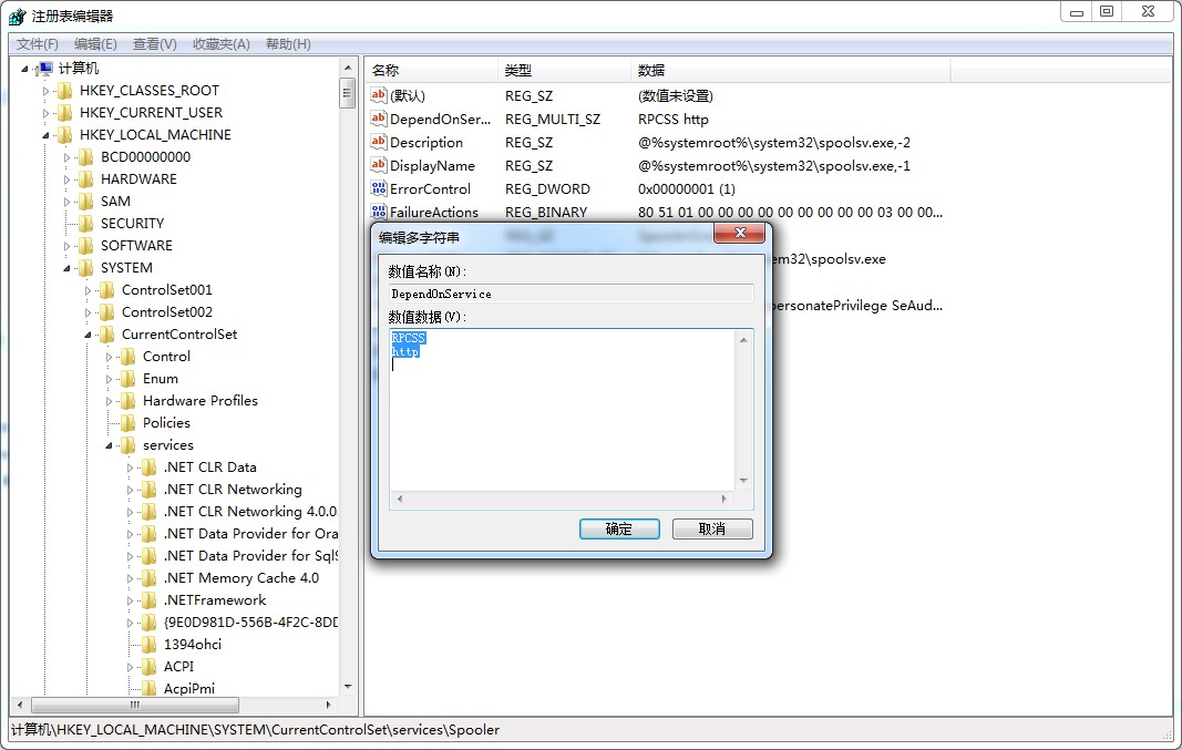 选定Spooler这个文件夹,在右边窗口里找DependOnService这个键值